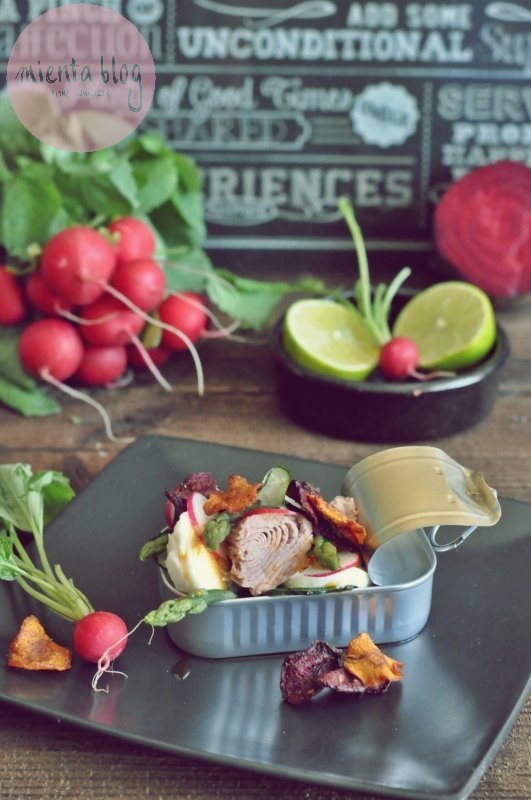 Bardzo fajny pomysł z czipsami warzywnymi i dot ego jeszcze z tuńczykiem. Podoba mi się podanie w puszce. Naprawdę atrakcyjnie wygląda.